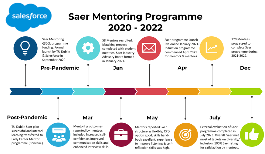 The efficacy of the Saer mentoring programme was proven to have been successful in enabling it to achieve its overarching objectives. The targets set by the agreement between Salesforce and TU Dublin: